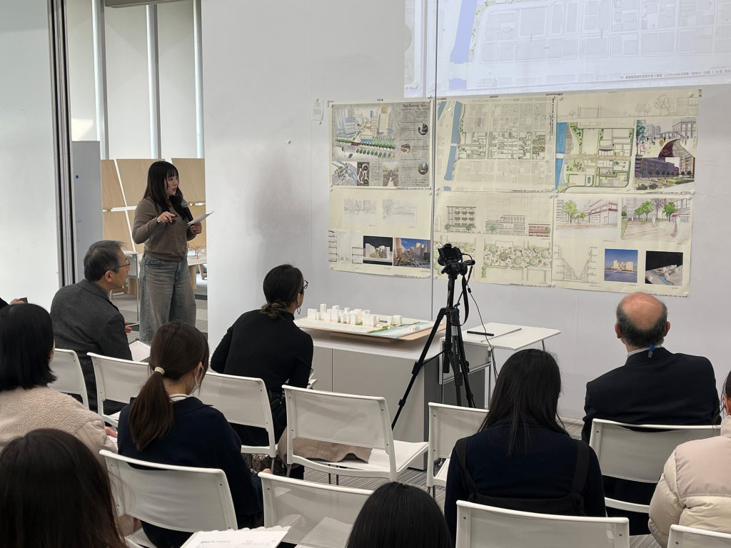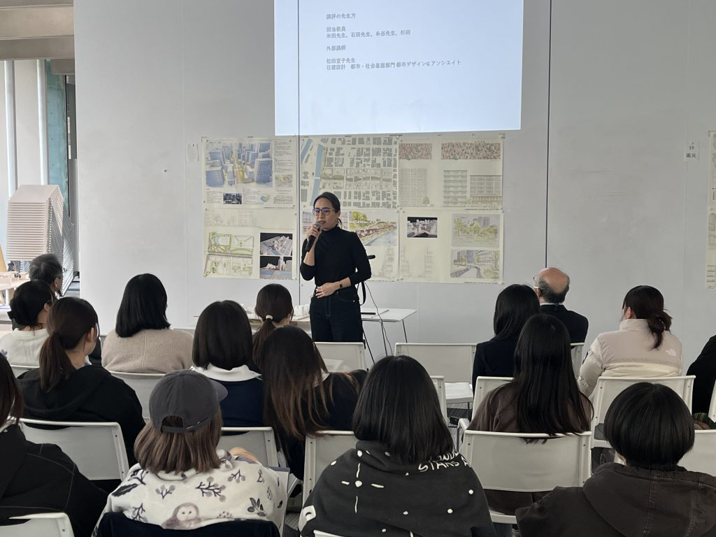 1月29日,30日に講評会を実施し、図面や透視図、模型を使って学生全員が発表しました。外部講師として 松田宣子 先生(株式会社日建設計)、上田信也 先生(武庫川女子大学建築学部非常勤講師)にご参加いただきました。