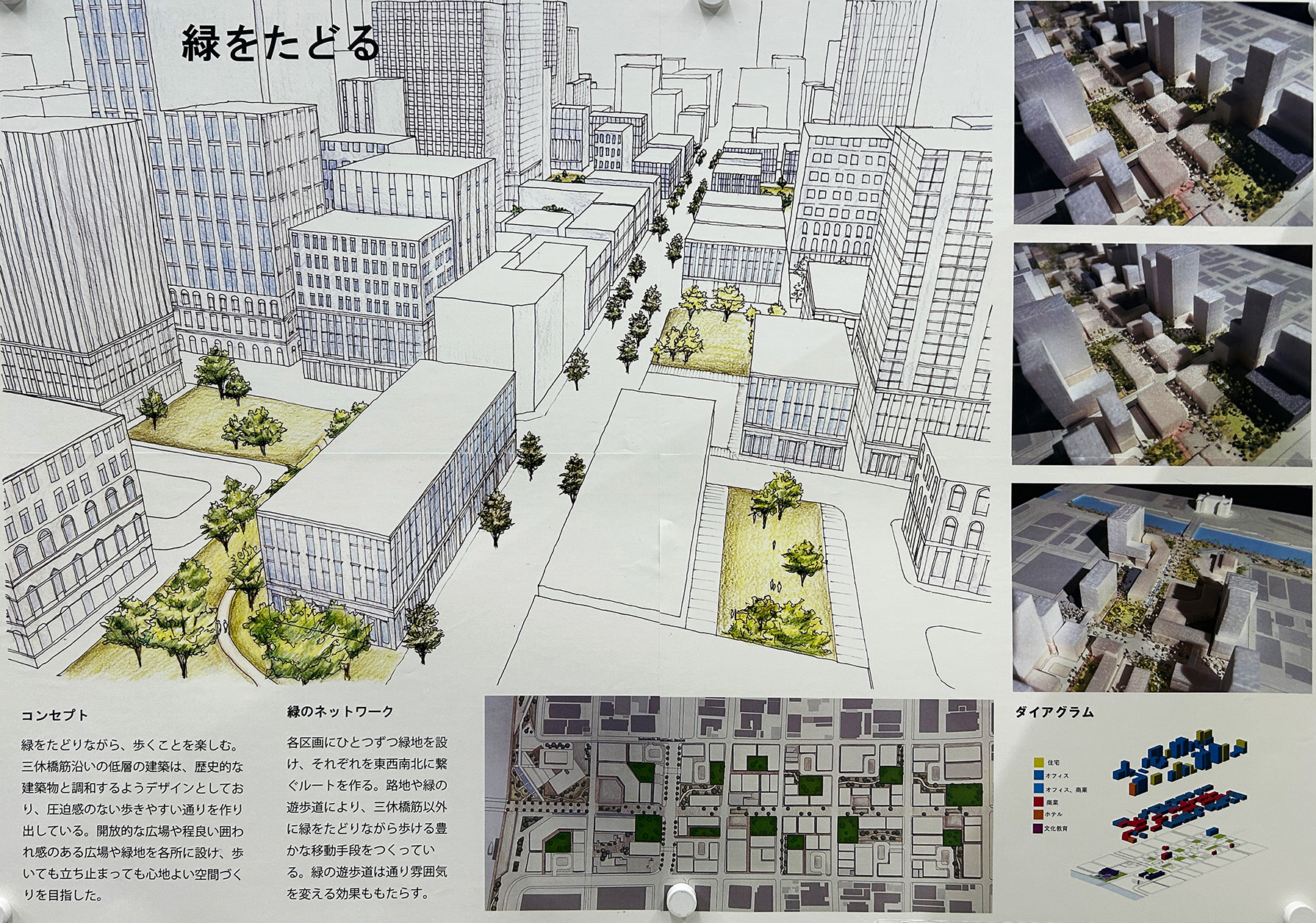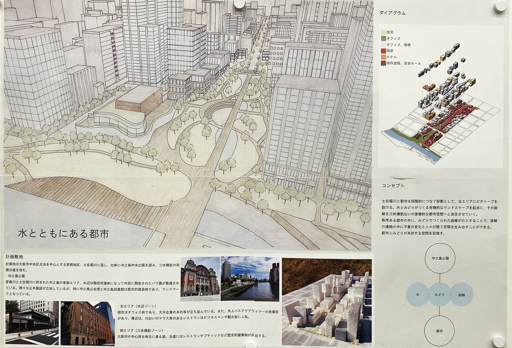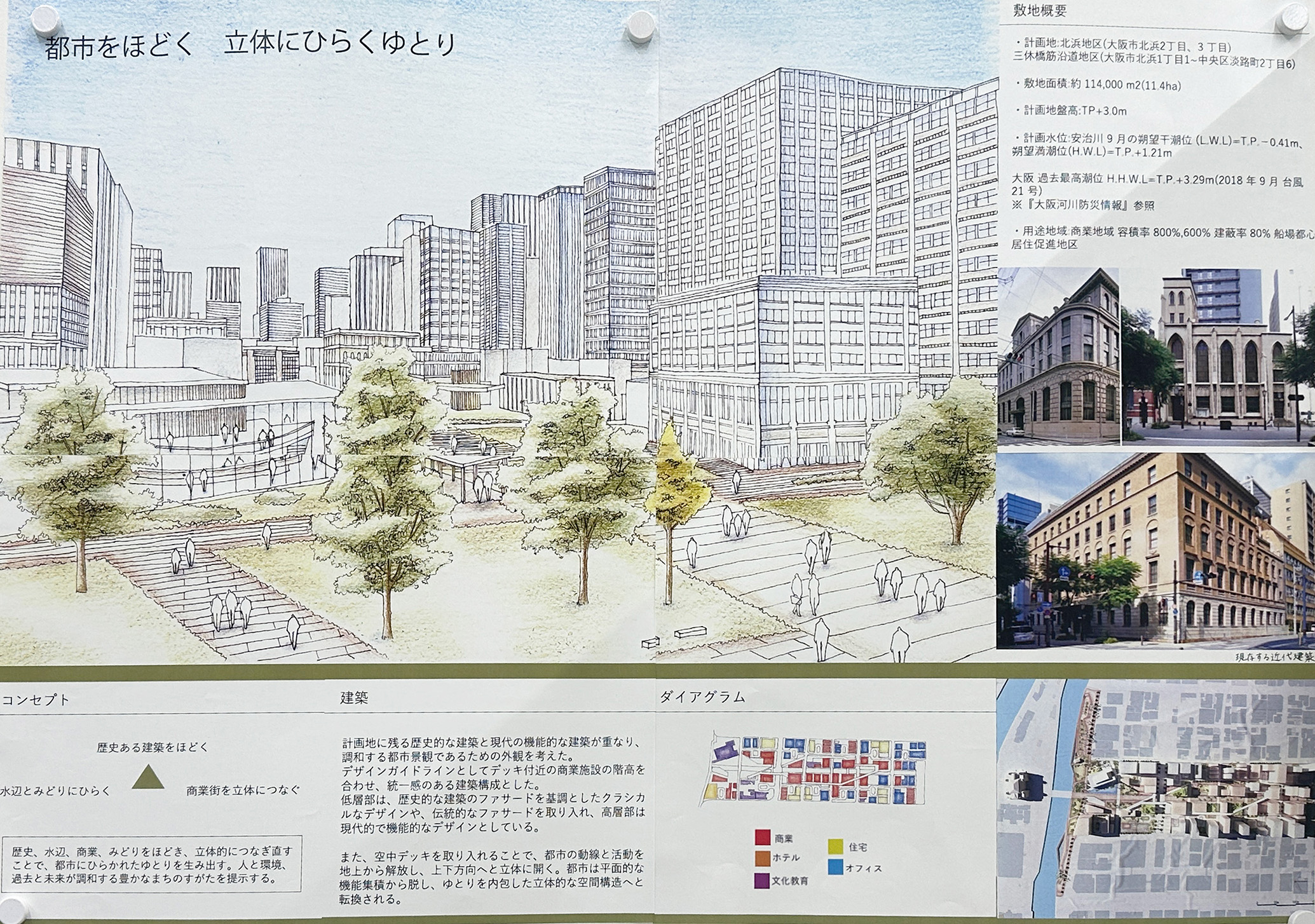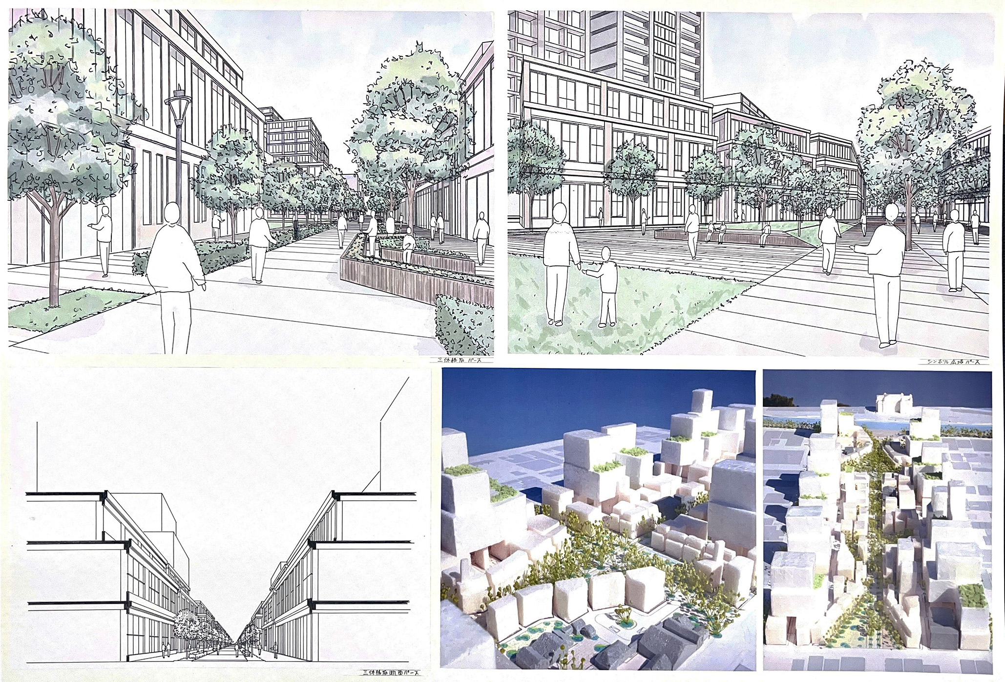 大阪都心部のビジネス街を対象として歴史的な建築物を含む街並みを設計する都市デザインの課題です。フィールドワークで敷地内の歴史的建築物のファサードをスケッチし、その要素を分析しました。歴史と現代が調和する街並み、歴史的建築物が見える広場、公園、これらを結ぶ路地などスケッチや模型でスタディし、敷地全体のヒューマンスケールな都市空間を構成しました。最終プレゼンテーションでは模型やスケッチパースなどを用いて各自が思い描く都市のイメージを発表しました。