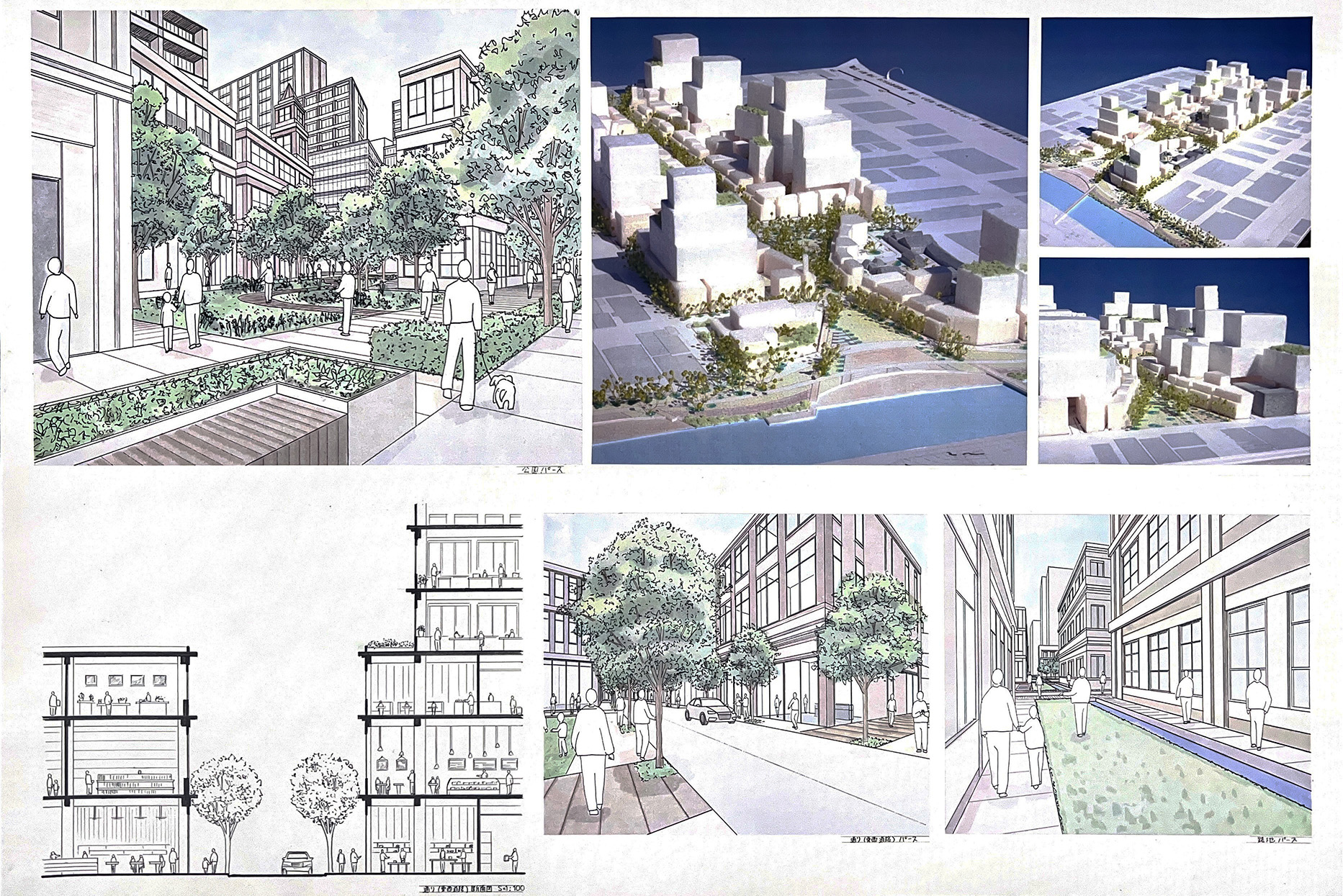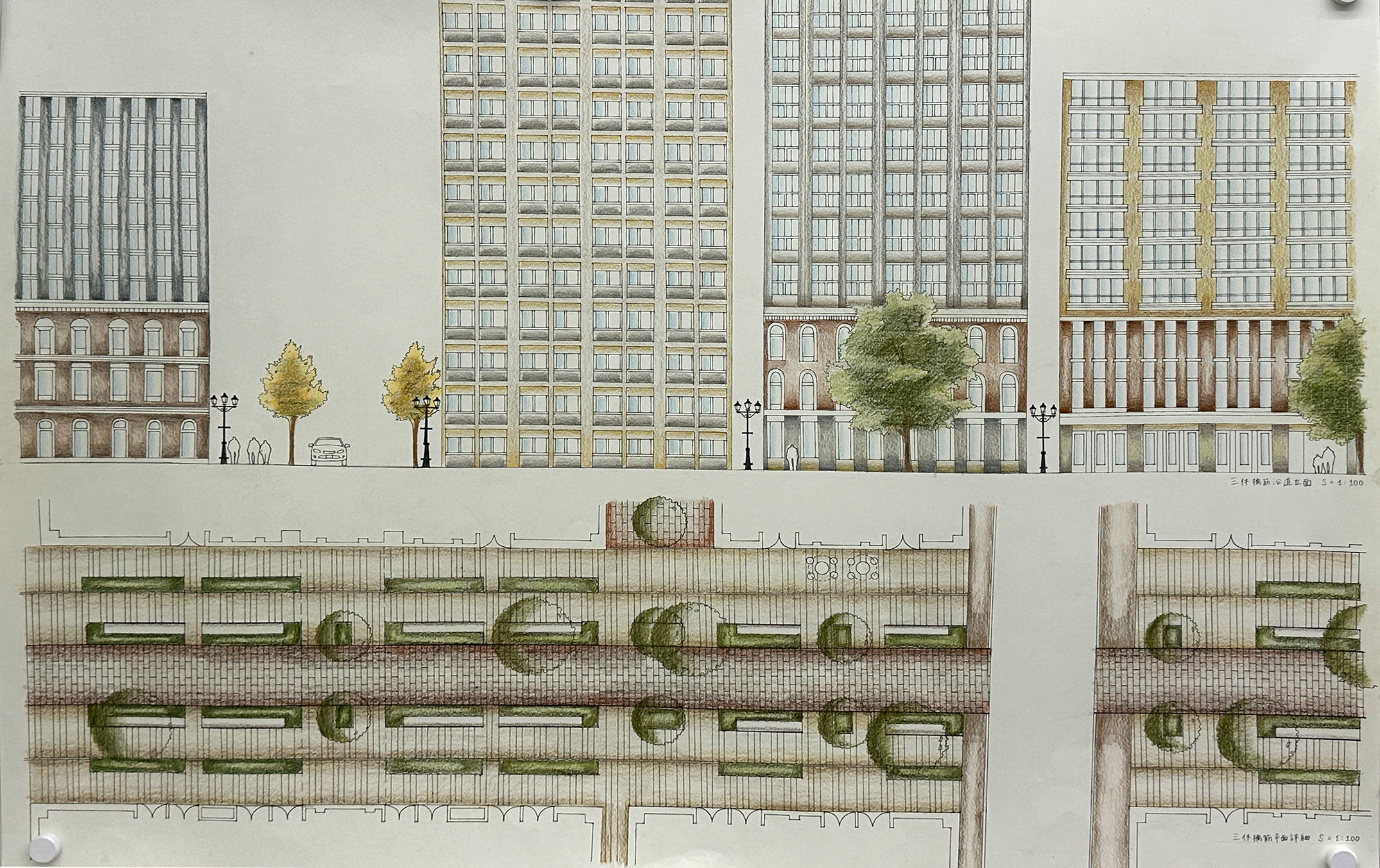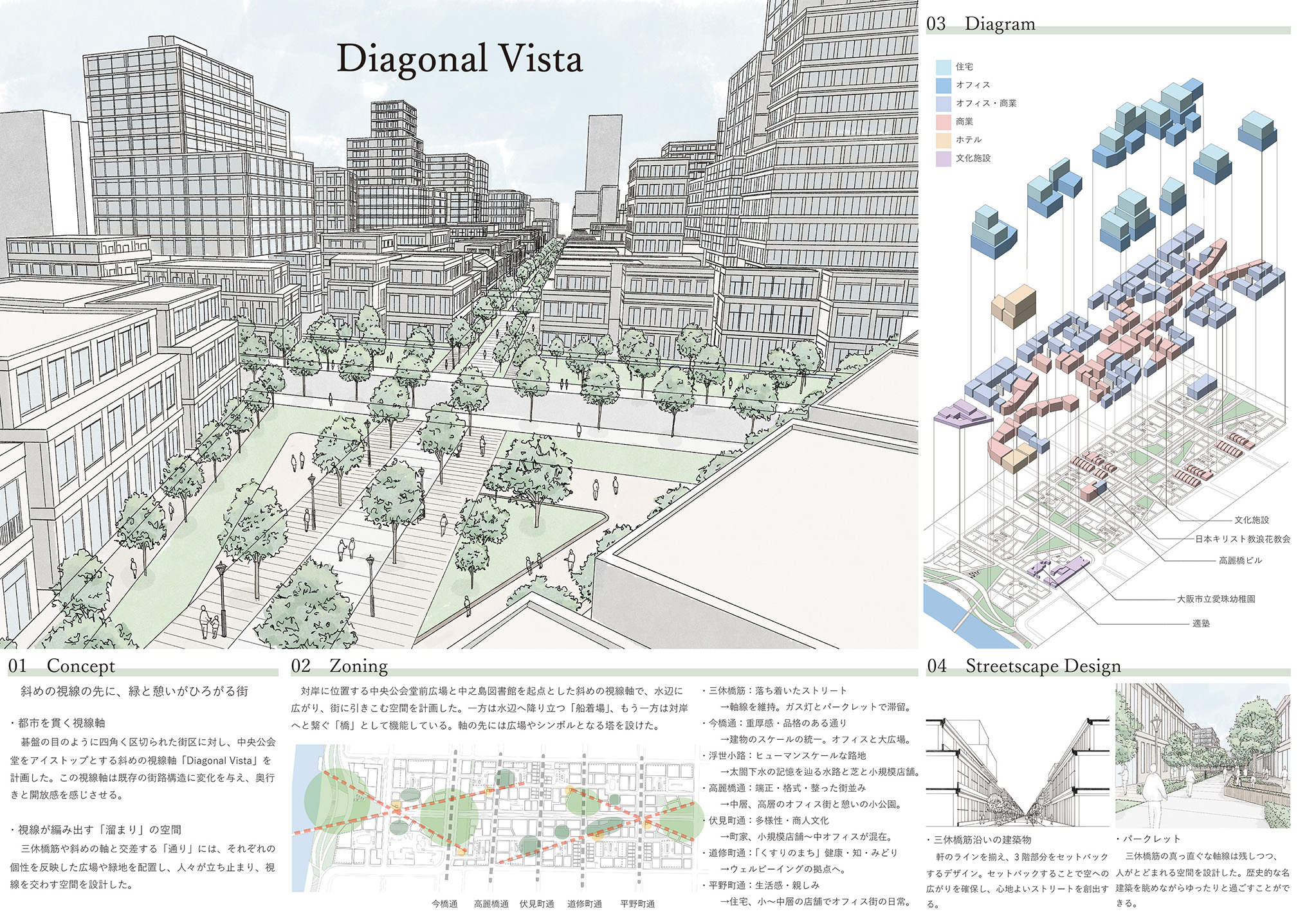 大阪都心部のビジネス街を対象として歴史的な建築物を含む街並みを設計する都市デザインの課題です。フィールドワークで敷地内の歴史的建築物のファサードをスケッチし、その要素を分析しました。歴史と現代が調和する街並み、歴史的建築物が見える広場、公園、これらを結ぶ路地などスケッチや模型でスタディし、敷地全体のヒューマンスケールな都市空間を構成しました。最終プレゼンテーションでは模型やスケッチパースなどを用いて各自が思い描く都市のイメージを発表しました。