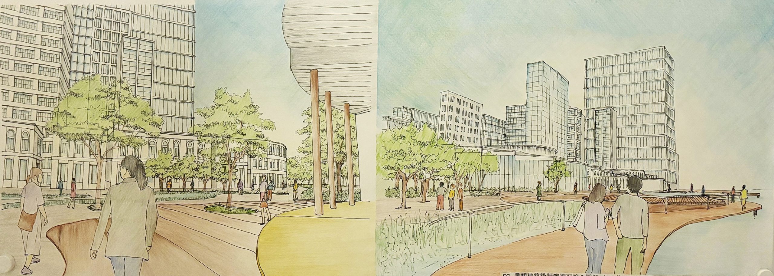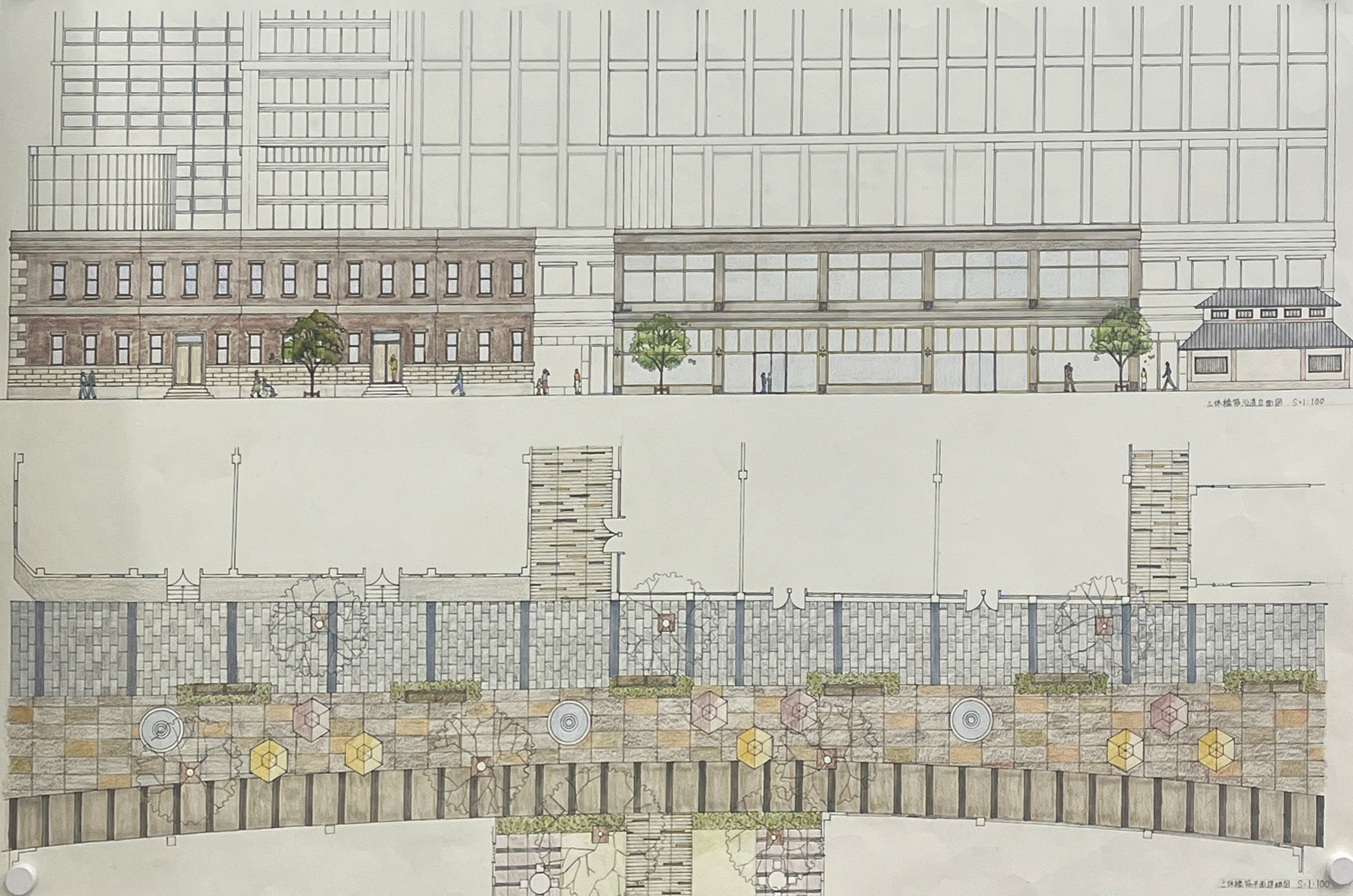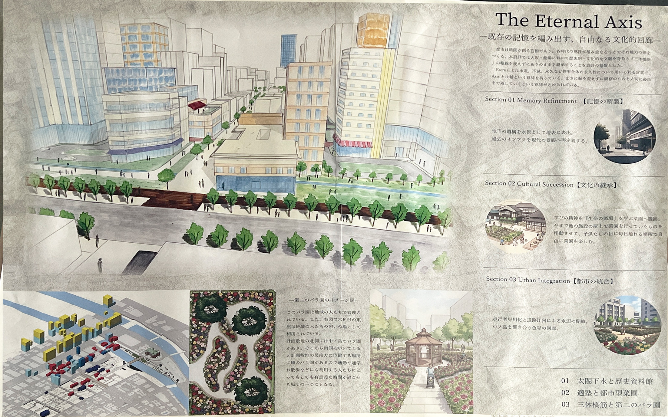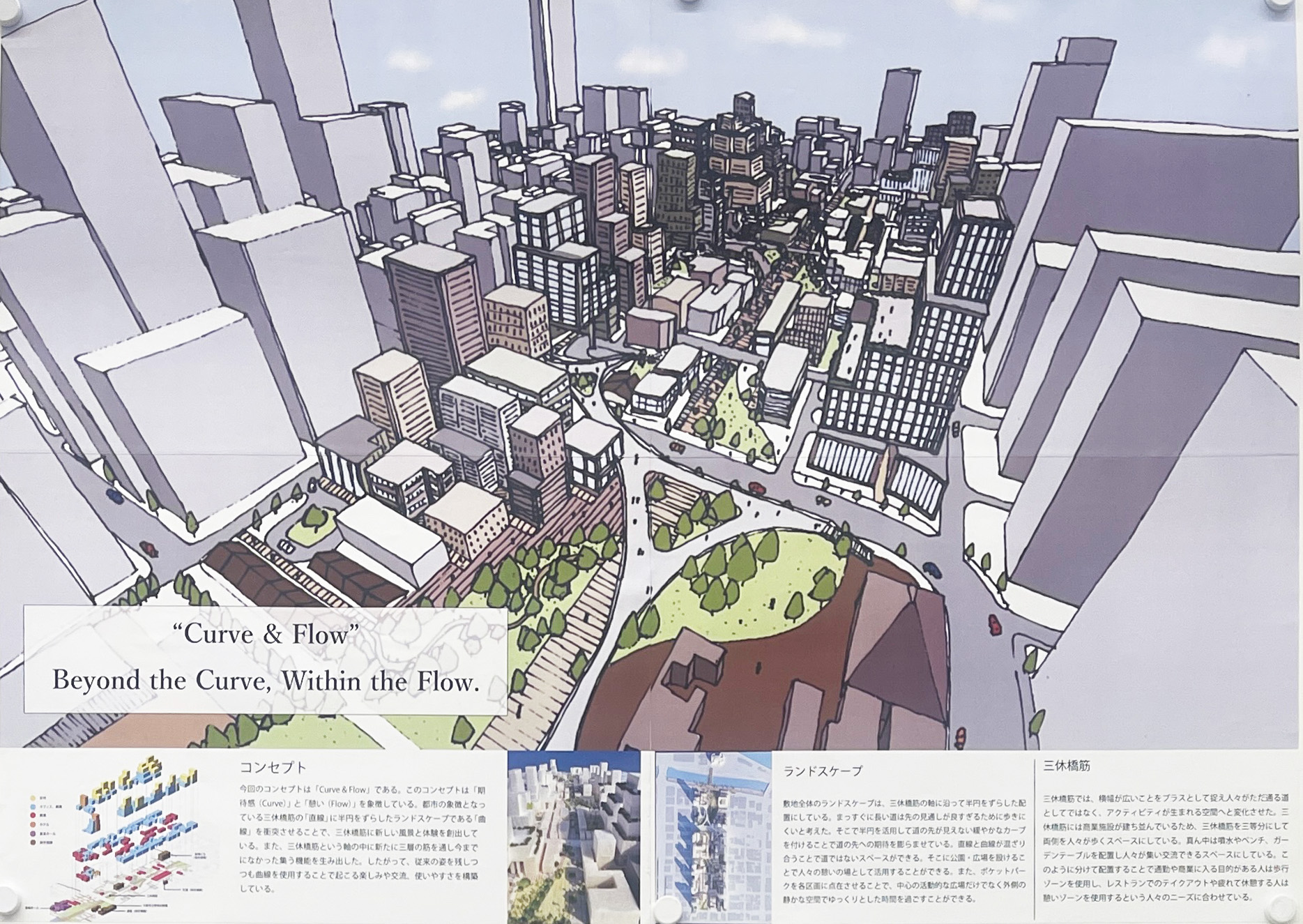 大阪都心部のビジネス街を対象として歴史的な建築物を含む街並みを設計する都市デザインの課題です。フィールドワークで敷地内の歴史的建築物のファサードをスケッチし、その要素を分析しました。歴史と現代が調和する街並み、歴史的建築物が見える広場、公園、これらを結ぶ路地などスケッチや模型でスタディし、敷地全体のヒューマンスケールな都市空間を構成しました。最終プレゼンテーションでは模型やスケッチパースなどを用いて各自が思い描く都市のイメージを発表しました。