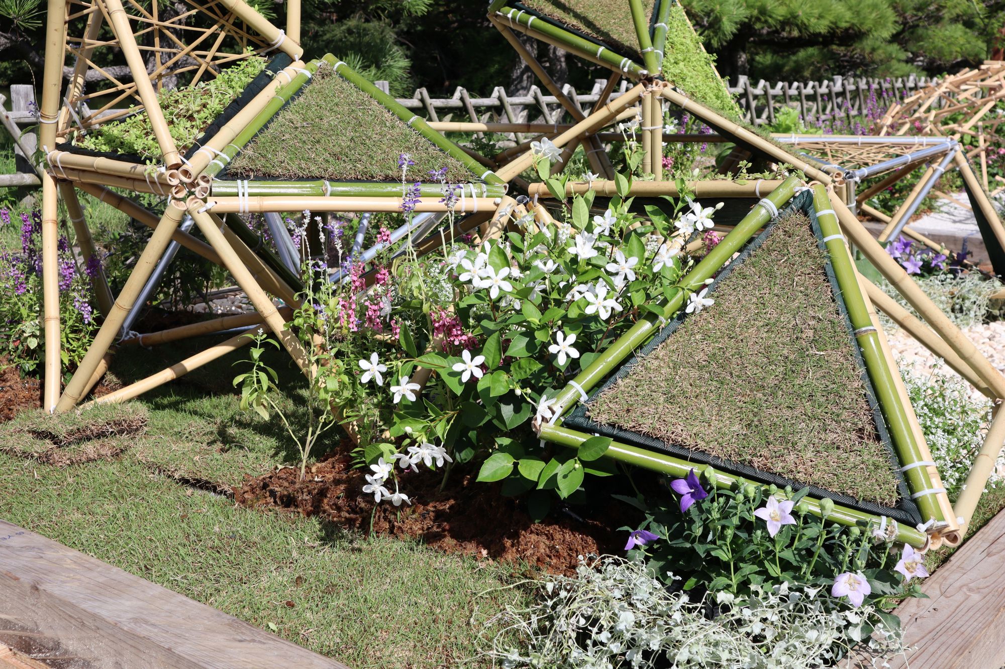 「自然と構築物の融合」をテーマに、竹で作ったフレームと面状化した植栽パネルで構築物を構成し、植栽と構築物の一体化を目指しました。