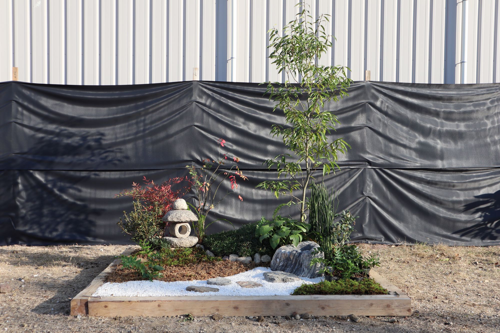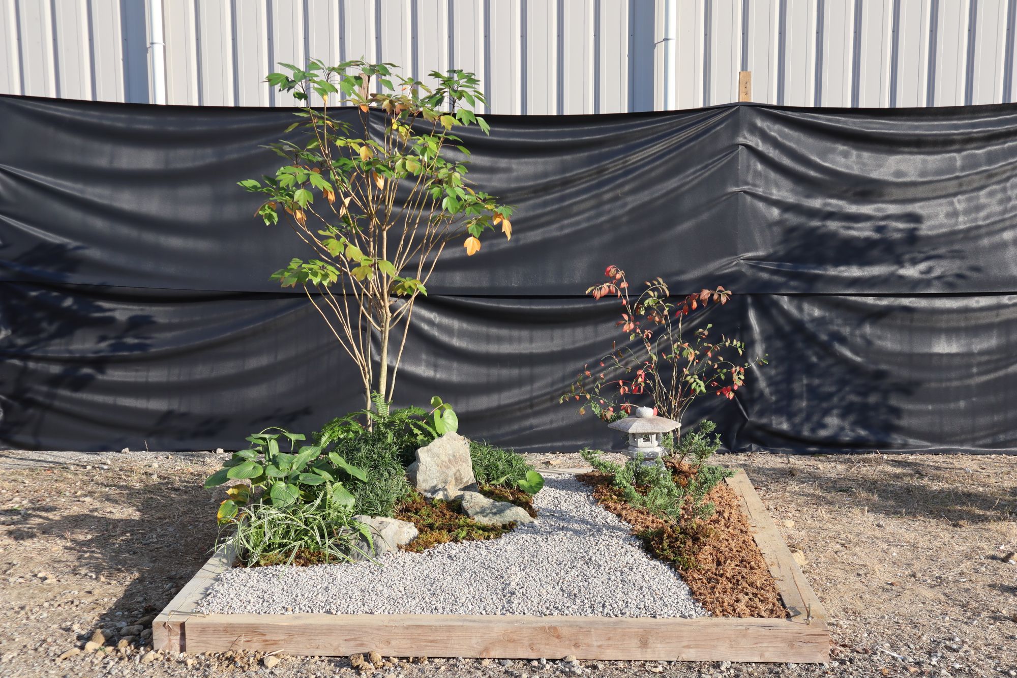 実際に資材を置いてみて石材や低木の配置を検討