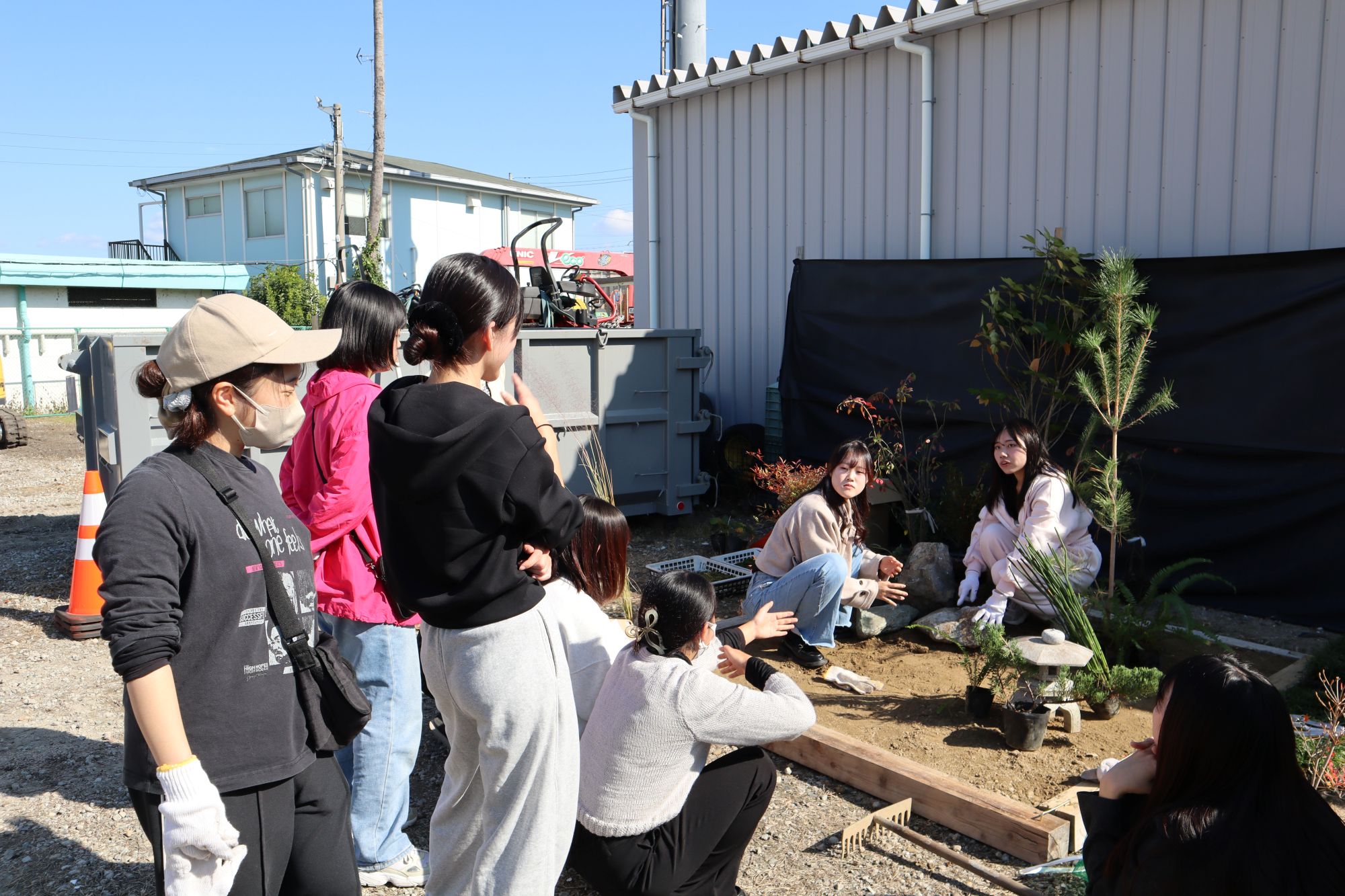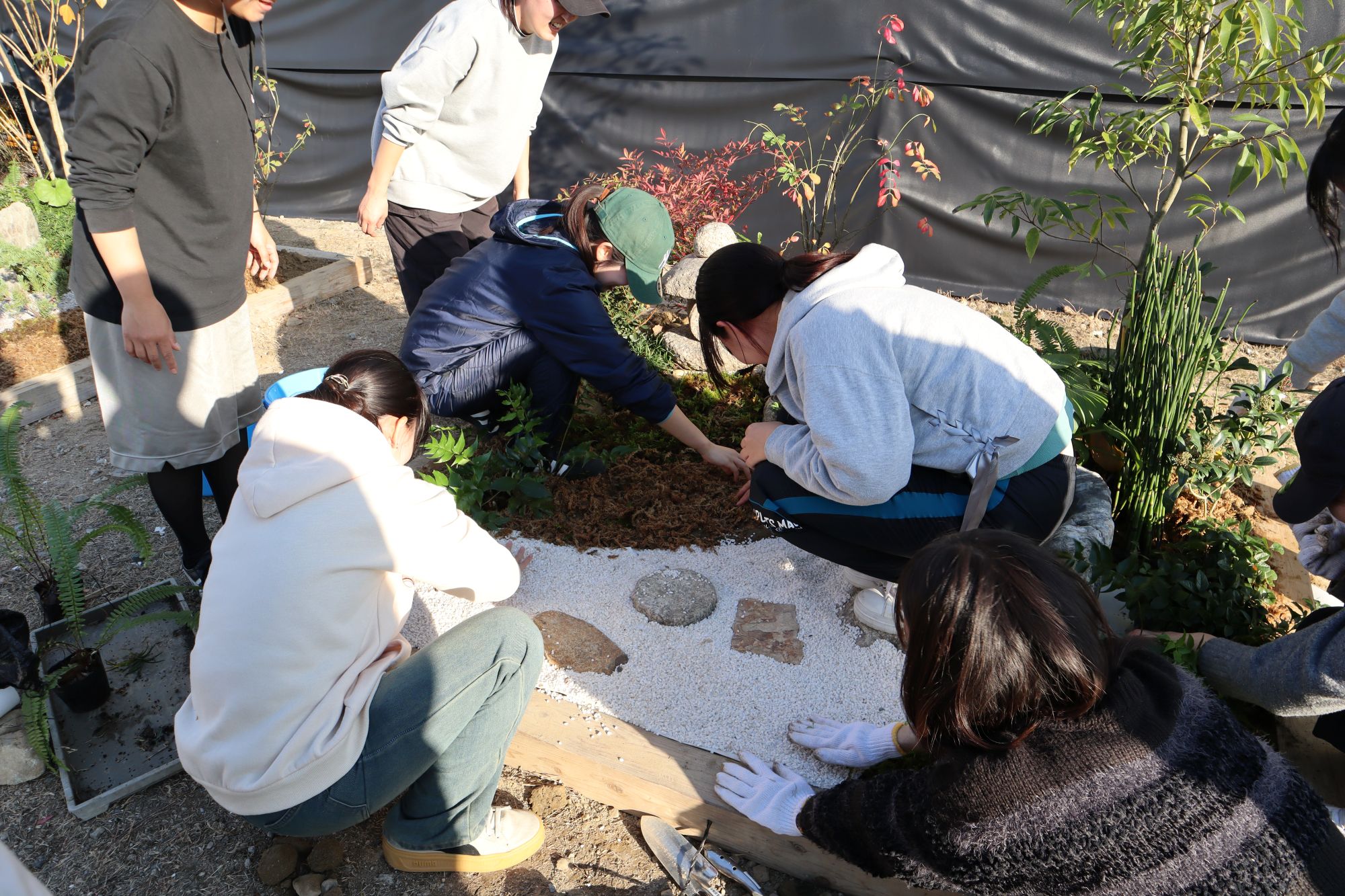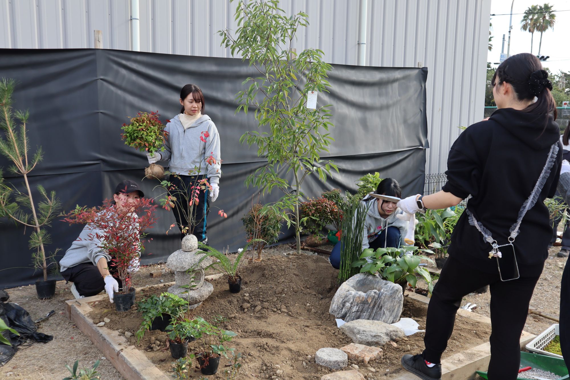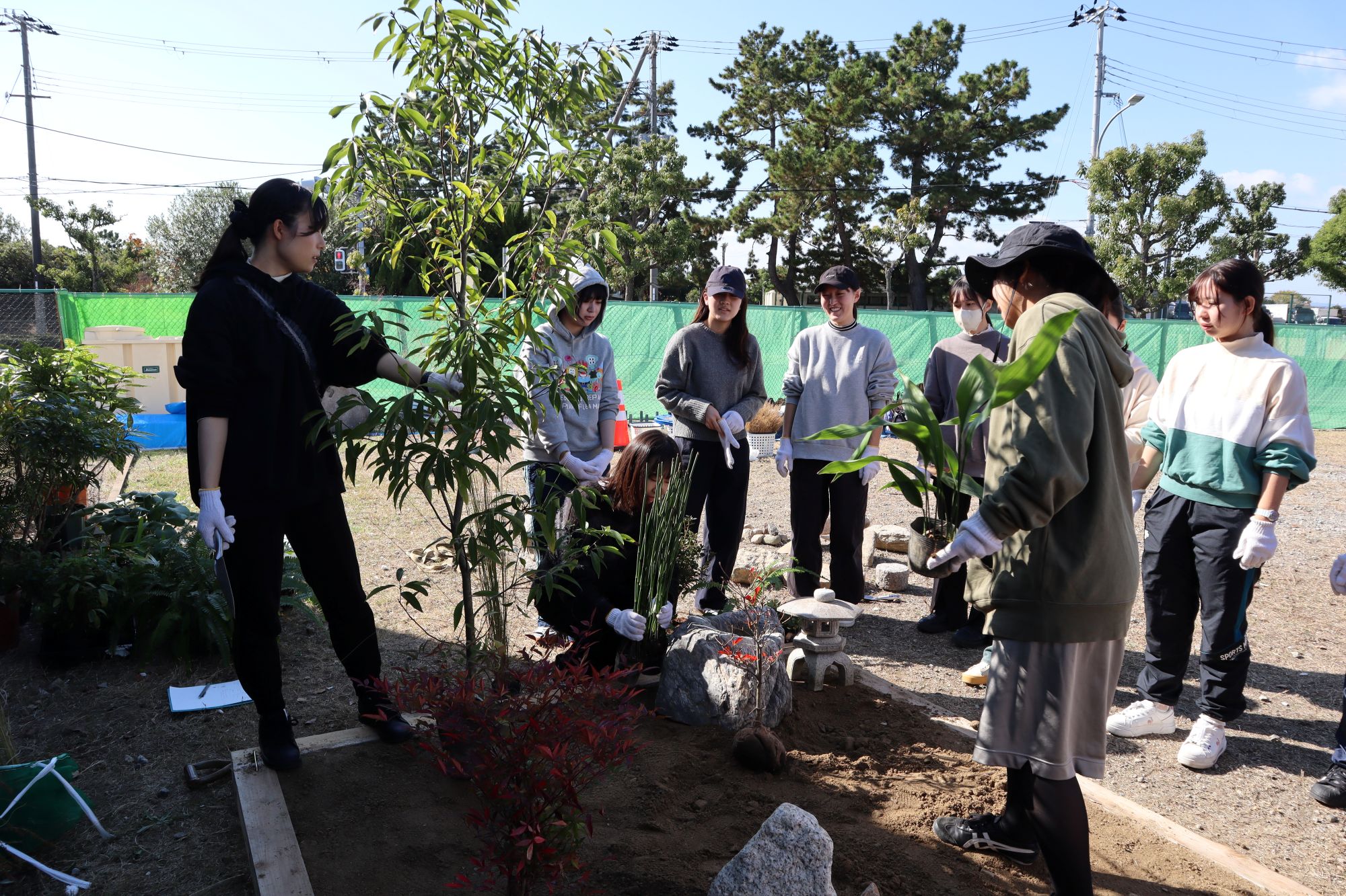植物実習で講師としてお世話になっている阪神園芸株式会社の前野先生にご指導、ご協力頂き、作庭実習を行いました。阪神電気鉄道株式会社様の所有地(兵庫県⻄宮市枝川町)をお借りし、2グループに分かれてそれぞれ、2m×2mの小庭園の施工を体験しました。