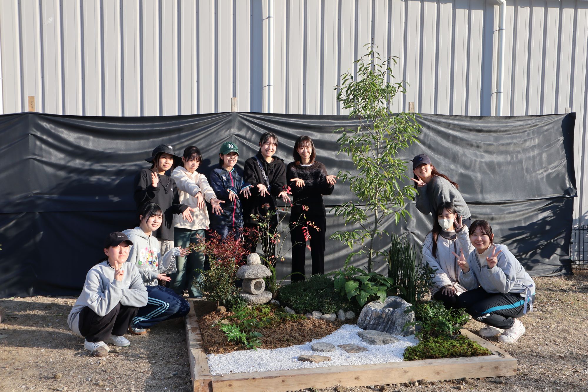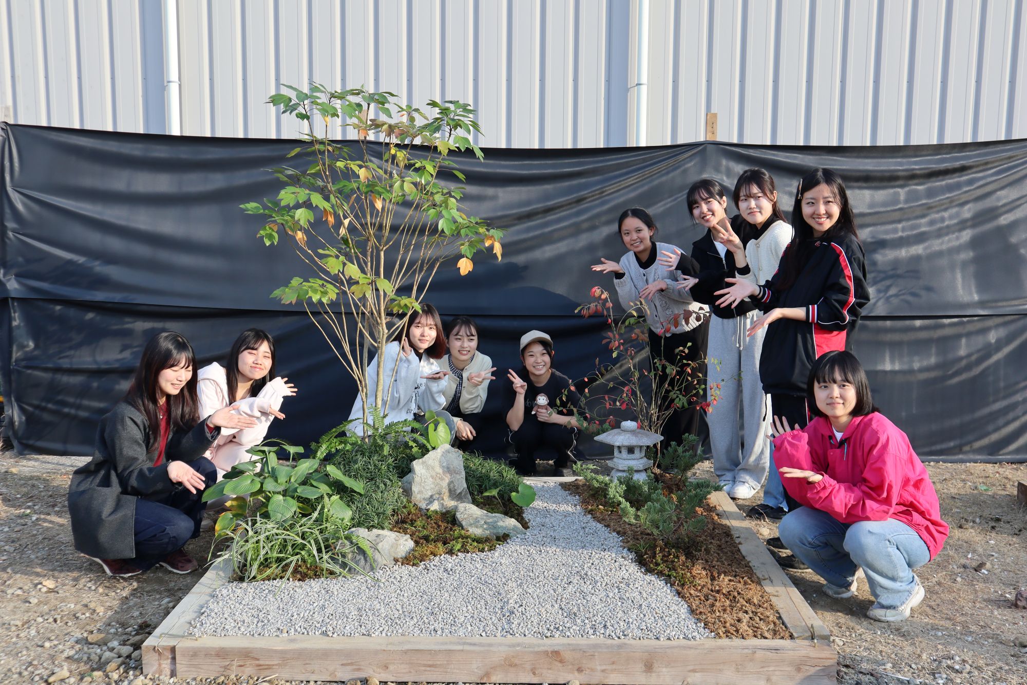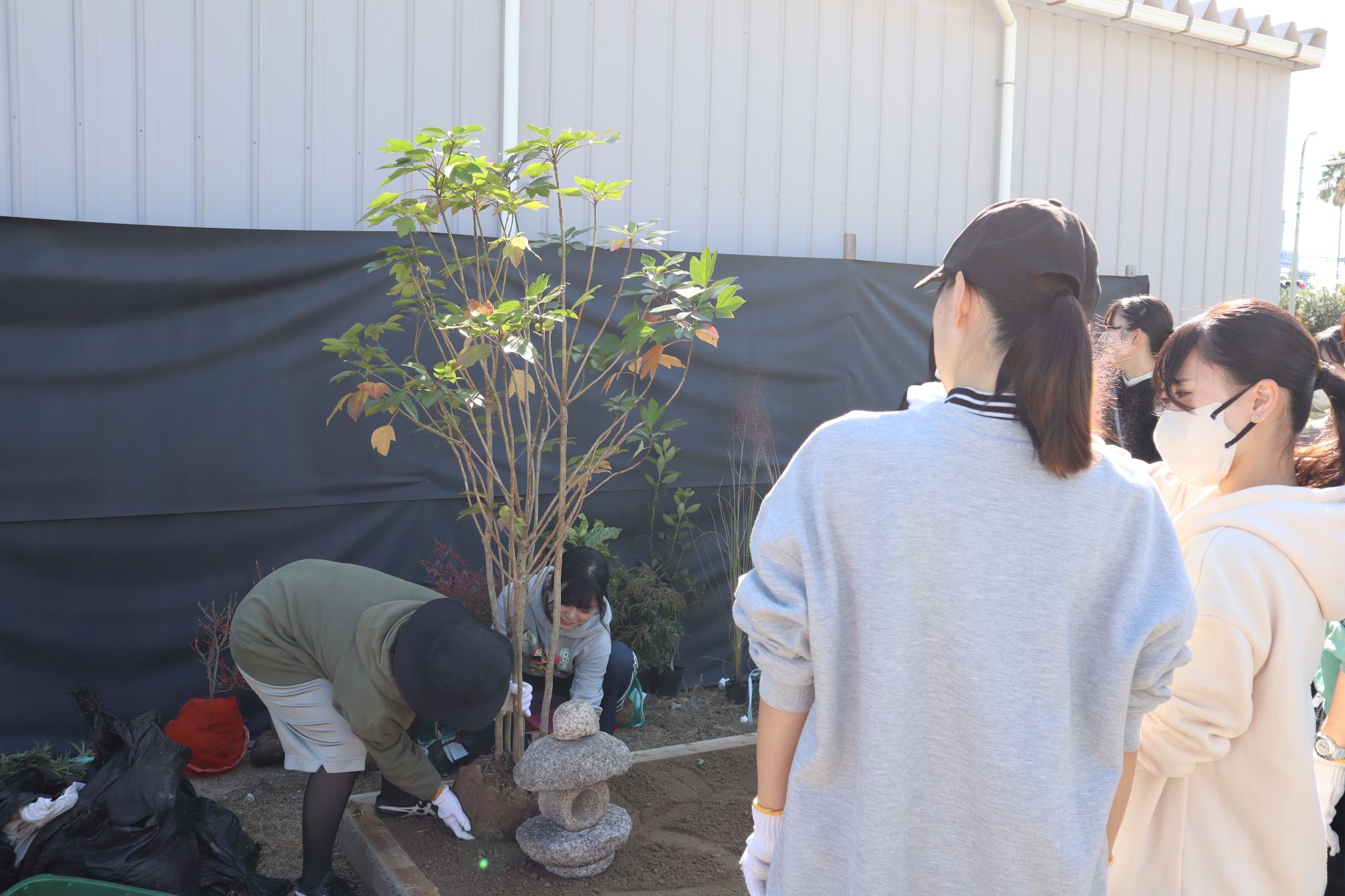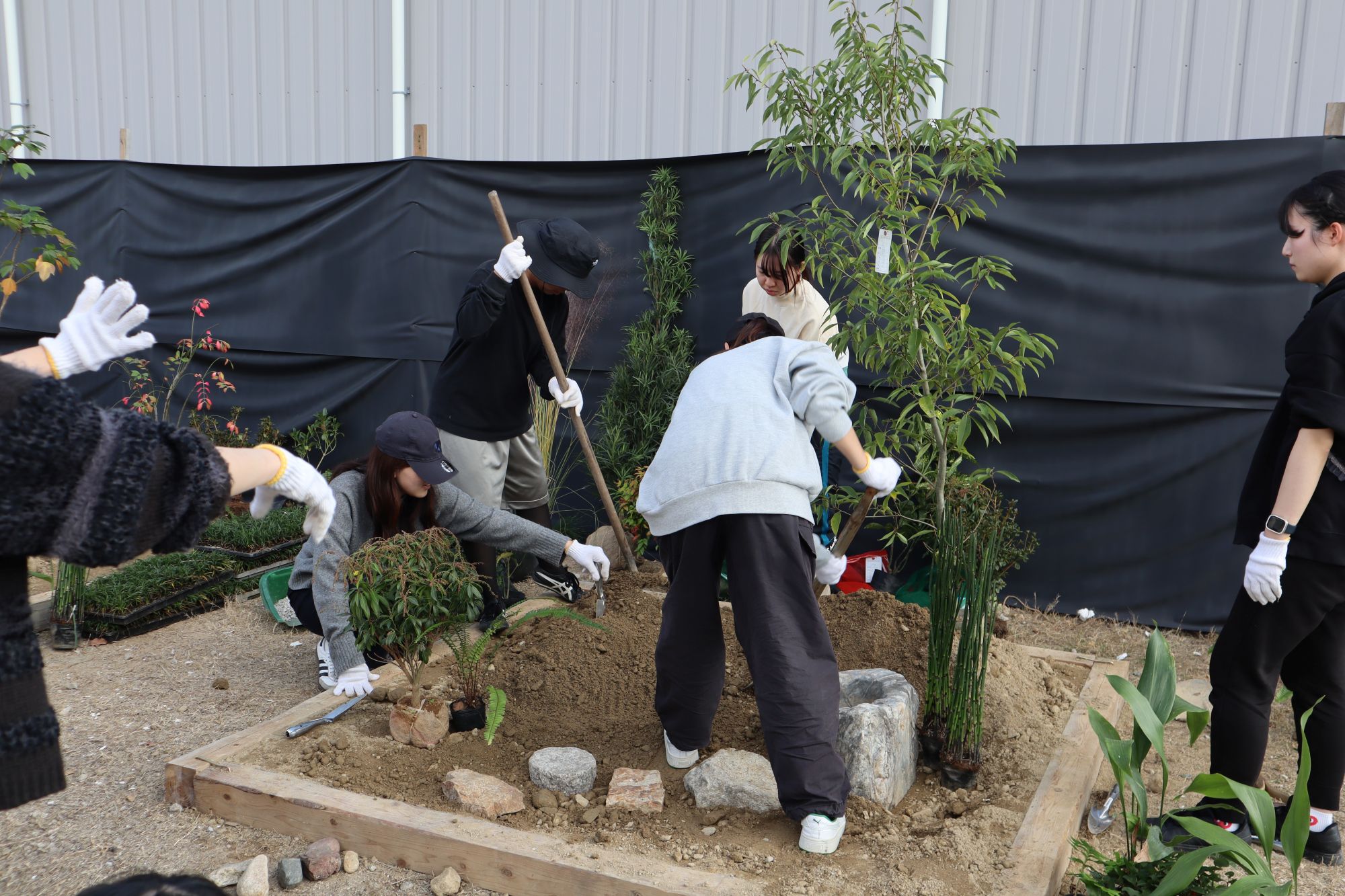 植物実習で講師としてお世話になっている阪神園芸株式会社の前野先生にご指導、ご協力頂き、作庭実習を行いました。阪神電気鉄道株式会社様の所有地(兵庫県⻄宮市枝川町)をお借りし、2グループに分かれてそれぞれ、2m×2mの小庭園の施工を体験しました。