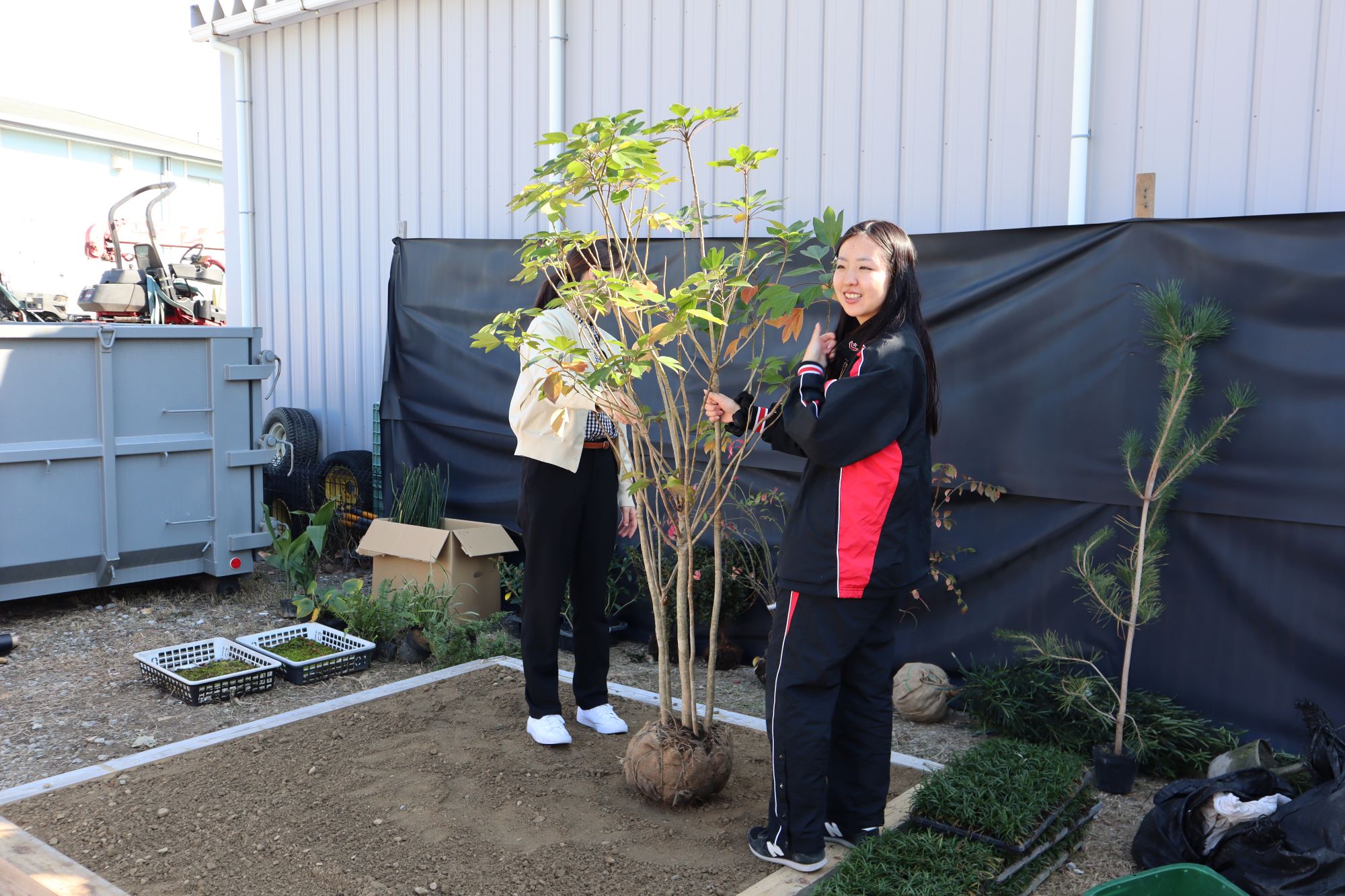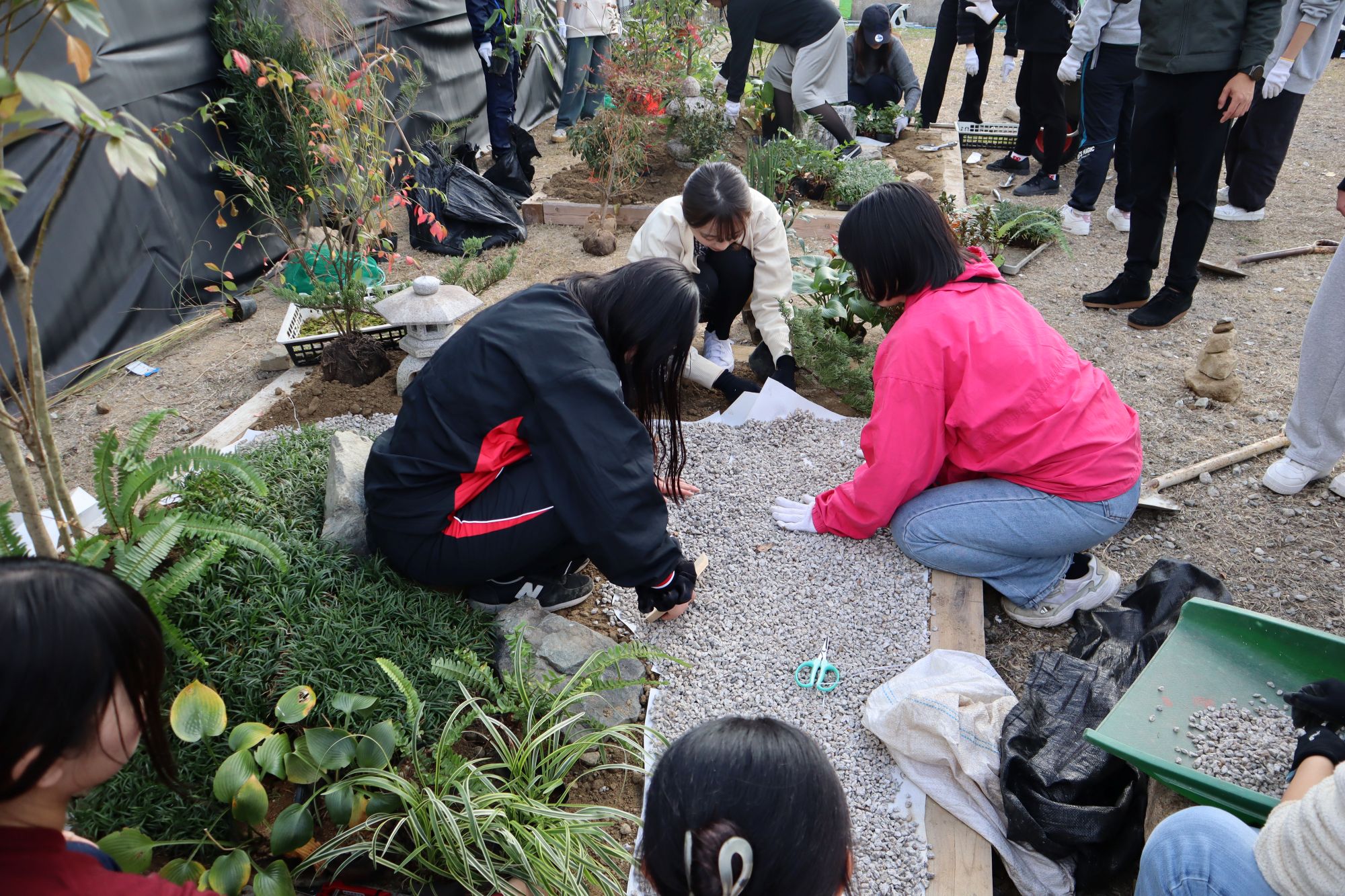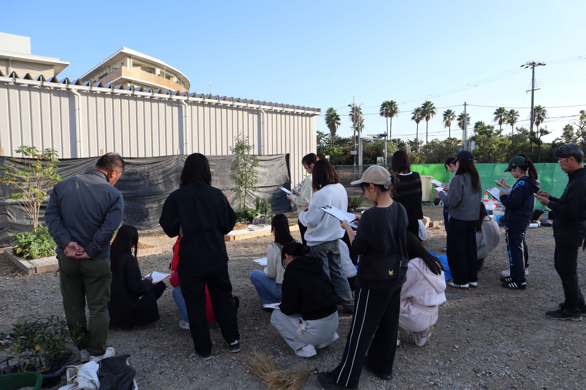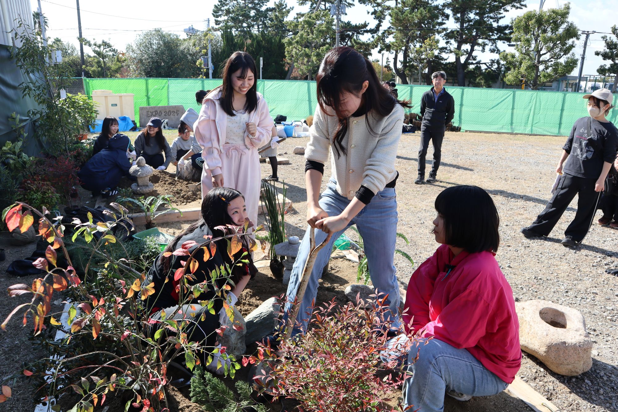 植物実習で講師としてお世話になっている阪神園芸株式会社の前野先生にご指導、ご協力頂き、作庭実習を行いました。阪神電気鉄道株式会社様の所有地(兵庫県⻄宮市枝川町)をお借りし、2グループに分かれてそれぞれ、2m×2mの小庭園の施工を体験しました。