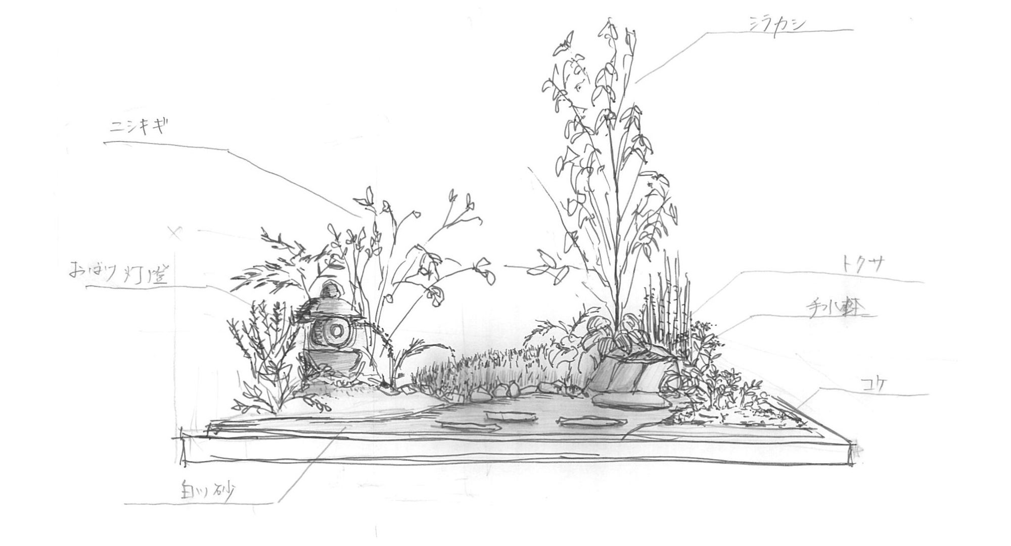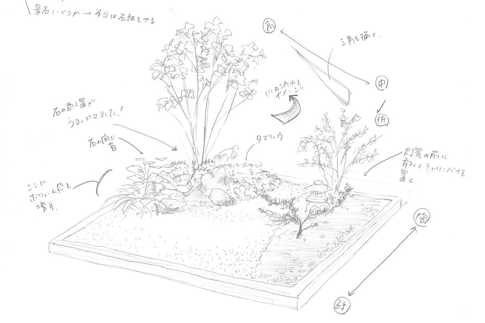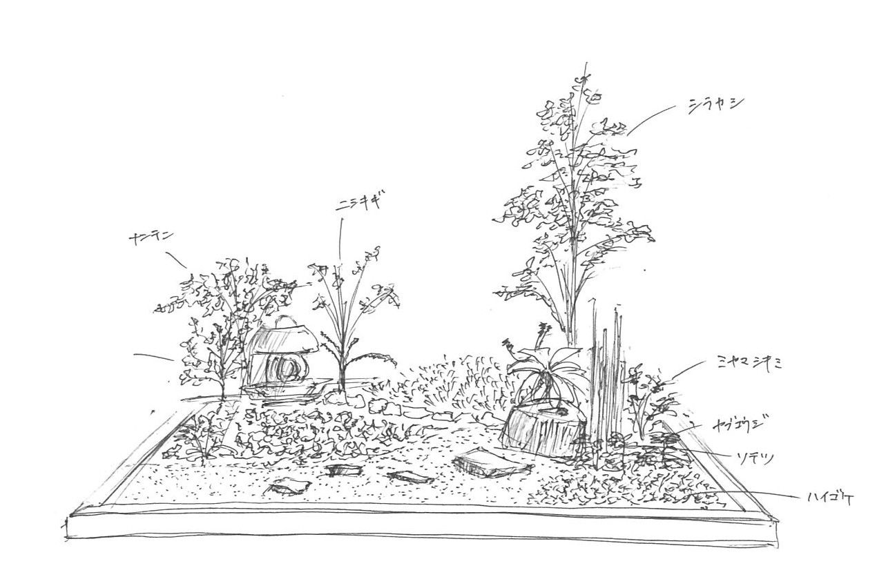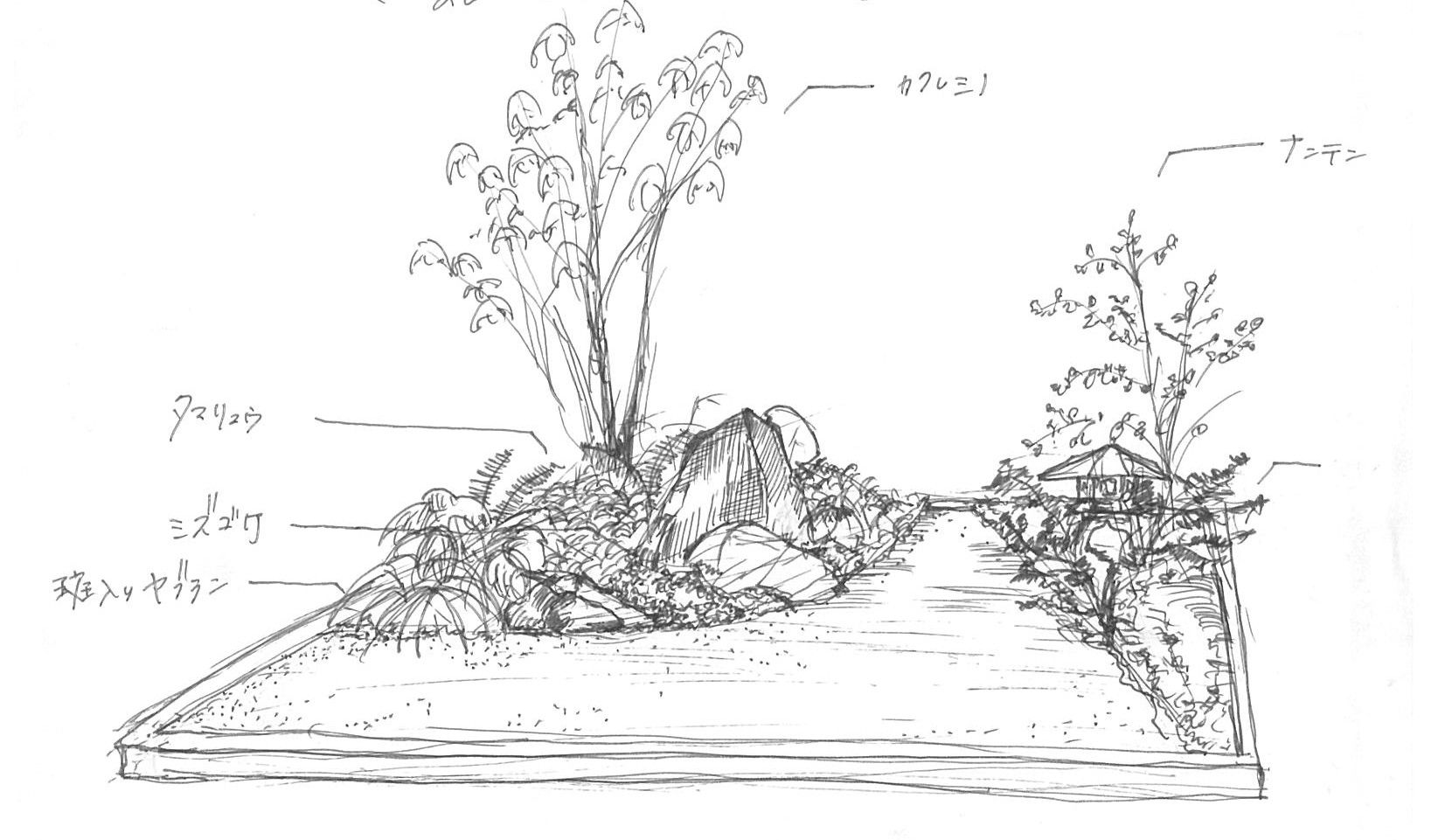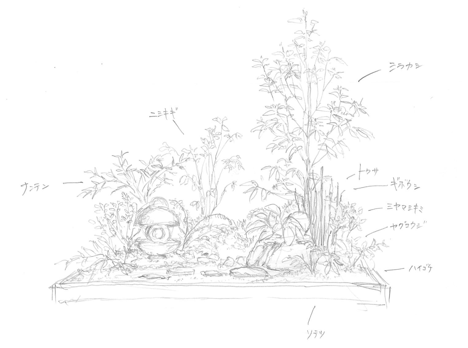 完成した小庭園を短時間でスケッチ