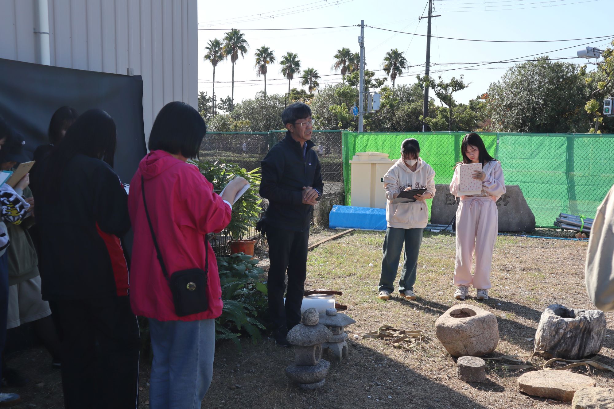 前野先生から石材、植物など造園資材について説明を受ける。前野先生の他、田邉先生をはじめ、阪神園芸のスタッフの方には施工場所や資材を事前にご準備頂きました。