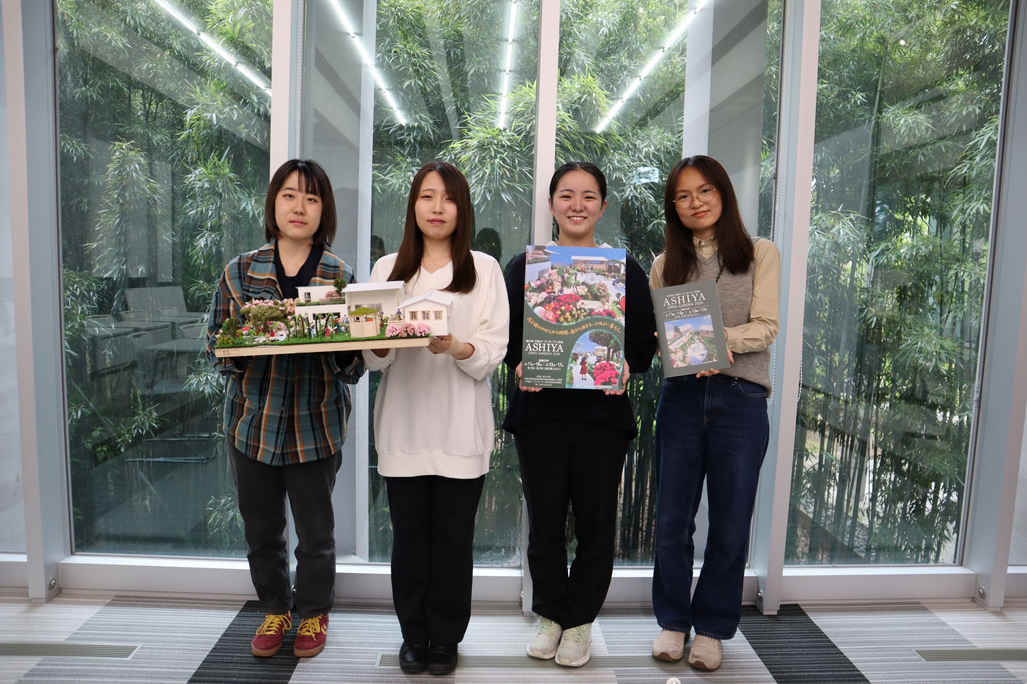 芦屋市と武庫川女子大学が締結する包括連携協定に基づき、芦屋市都市政策部 道路・公園課が本学の景観建築学科に対し、「第21回芦屋オープンガーデン2026」のパンフレットの表紙、裏表紙のデザインとポスターの作成を依頼。景観建築学科4年生の有志4名がデザインに取り組みました。